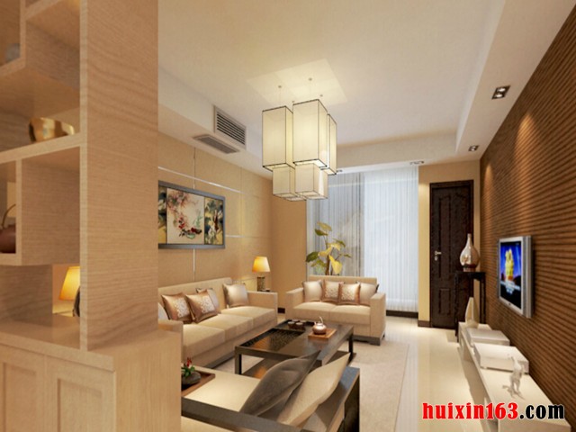 客厅的整体装饰给人的温馨气氛比较浓烈,白色的顶面装饰加上造型奇特的大型吊灯的使用让客厅的温馨气氛更加的突出,白色的瓷砖地面装饰加深了空间的明亮感和延伸感,整体的白色家具的使用搭配一个黑色的实木茶几更具有装饰的独特韵味,沙发背景墙的设计采用了实木和不锈钢进行石膏线的打造,产生的立体感比较突出,一个大型的五颜六色的装饰画的存在为客厅的装饰美感带来更多的诠释,电视背景墙的设计给人一种空间分割的感觉, 深棕色的条纹设计让电视背景墙的装饰更具有舒适感,一个大型的浅色的实木搁置架的存在可以是装饰品的区域,还可以起到空间划分的作用。