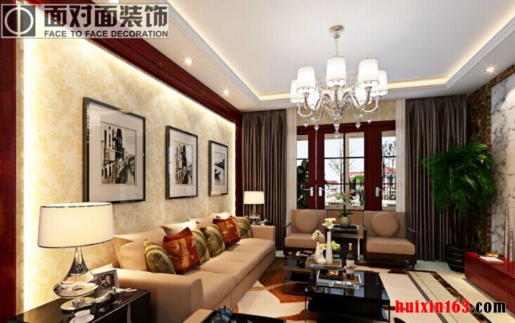 客厅中的电视背景墙设计比较大气,使用了石材做造型设计,淡淡的纹路使其显得更加高档,电视下方搭配了一款红色的电视柜,小巧的体积却又精细的做工,使其显得更加精致,一旁角落里摆放了一株绿植,青葱的绿植为客厅带来了生机,而且也净化了房间中的空气,在视觉上也起到了点缀的效果,与之相对的沙发背景墙装饰则显得比较素朴一些,只是悬挂了一组黑白色彩为主题的装饰画,这样的设计不仅凸显出了业主的品味,更是为房屋装饰增添了一丝时尚气息。